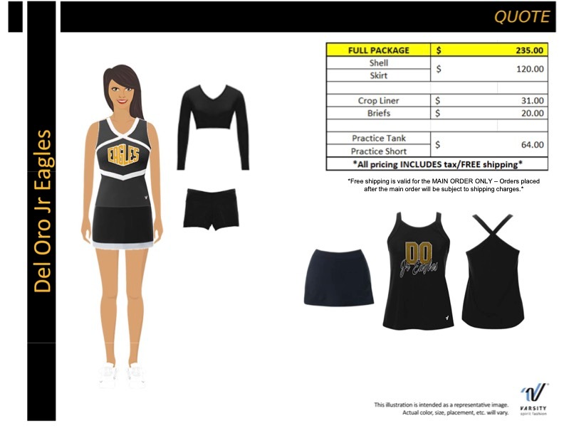 Tiny mite uniform is $235 (includes shell, skirt, liner, and jamboree outfit ); shoes are separate and a link will be sent by head coach; optional items to add to package are backpacks and jackets